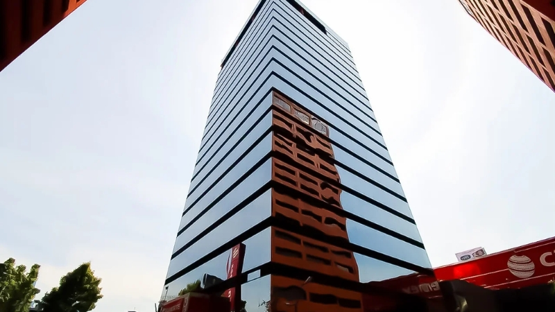 Ubicado en la CDMX con una fachada Stick y cristales templados reflectivos.